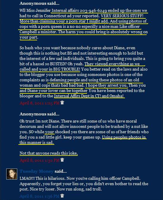 The kicker is Diane comes on my blog and furiously posts messages, acting like she's someone else, acting like more than one person would even stick up for her, and acting like she's some kind of big deal. She actually attacks me over and over again for using pictures of a cop, when you can't even see his face! Those pics are the ones she sent me so, how am I doing anything wrong?